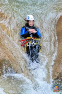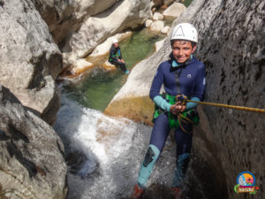 Vertical difficulty : Nature has sculpted waterfalls of varying heights that involve rope descents, slides or jumps of varying size. Be aware that jumps and slides are never obligatory. Either it is possible to walk around them easily, or it is not possible and in this case we can always help you down with a rope, which, trust us, is not very complicated! What is required, however, is to cross a certain height when there is no way around it. This mandatory height is specific to each canyon and is indicated under the term “Cascade Max” in the canyon descriptions. In order that you enjoy the session, it is nevertheless preferable to be able to jump a certain height depending on the difficulty of the canyon: approximately 1m for the Green canyons, 2m for the Blue, 3m for the Red and 4m for the Black. Water difficulty : Linked to the water flow and weather conditions. This natural variable has a considerable influence. We will make sure that conditions are always comfortable, especially for the less athletic and especially for the very young from 8 years old, who are more sensitive to the flow. Usually during the summer the flows are easy but sometimes they are more substantial. And some canyons are by nature more watery than others. Some sessions can be a little more « powerful » but always with optimal safety. In conditions of very high flow, even a small canyon considered easy can become very technical, even impassable if there is too much water. At this time, it is wise to give up on your sofa in front of Netflix.Which level to choose ? Green, Blue, Red, Black ?